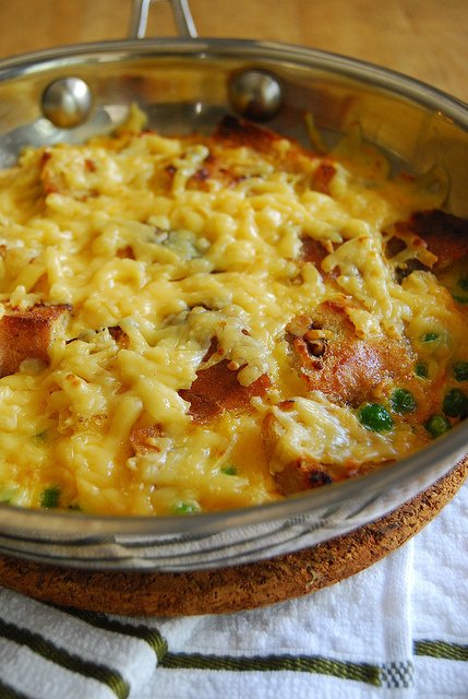 hosting service, just to warm them up. Add the bread back and try to distribute the peas and bread evenly around the pan without making too big a deal of it. Pour in the eggs and cook over low heat until almost everything is set. I sometimes cover the pan towards the end just to speed this process up.