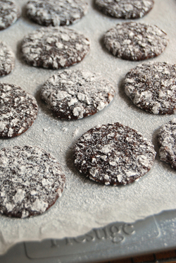 These aren't the domed topped chocolate crinkles that I grew up knowing. They baked quite flat. The batter is very runny, and even after many hours of chilling in the fridge, is was still not firm enough to handle. I think next time I'll leave the batter in the fridge overnight and see if that makes a difference. What I did for this batch is scooped bits of batter out by the teaspoonful, dropped it into the confectioner's sugar, and formed it into a ball between two tablespoons, while coating it in the sugar. The batter still spread tremendously so make sure you do not use any more that a teaspoonful, or as the recipe dictates, about a 3/4 inch ball. Despite their flat appearance the cookies have soft, chewy, chocolate-y centers with crisp edges. Still a good chocolate cookie!